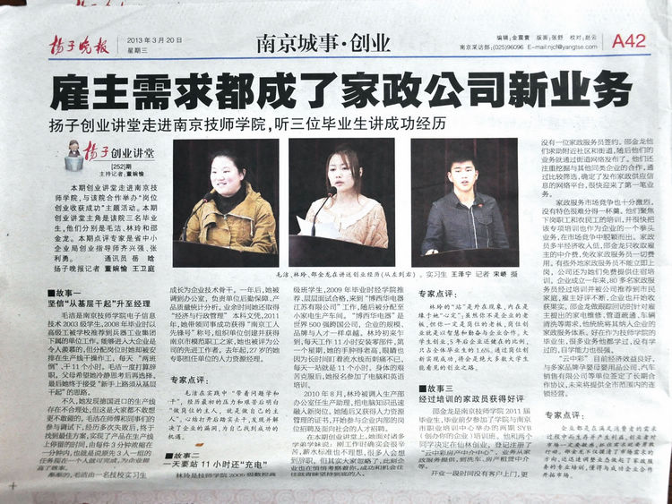 《扬子晚报》A42版—《雇主需求都成了家政公司新业务——扬子创业讲堂走进星空官方web版入口,听三位毕业生讲成功经历》