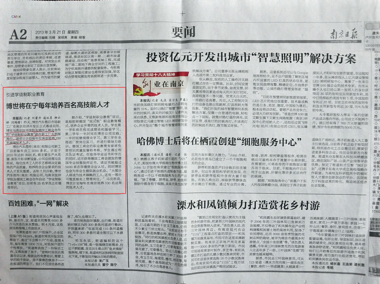 《南京日报》A2版-《引进学徒制职业教育-博世将在宁每年培养百名高技能人才》01