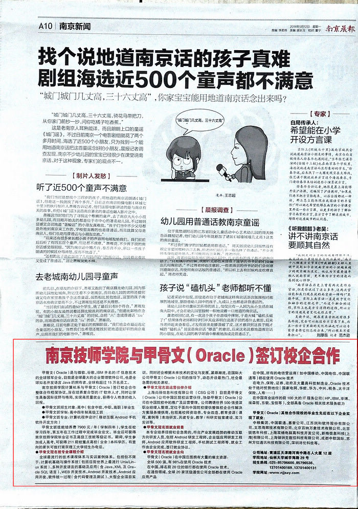 《南京晨报》A10版—星空官方web版入口与甲骨文(Oracle)签订校企合作
