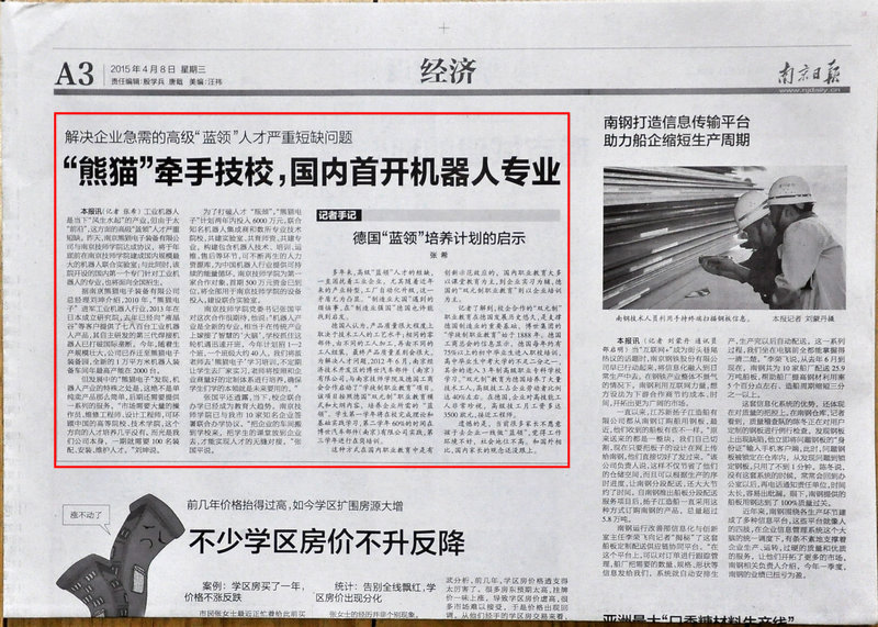 《南京日报》A3—“熊猫”牵手技校,国内首开机器人专业