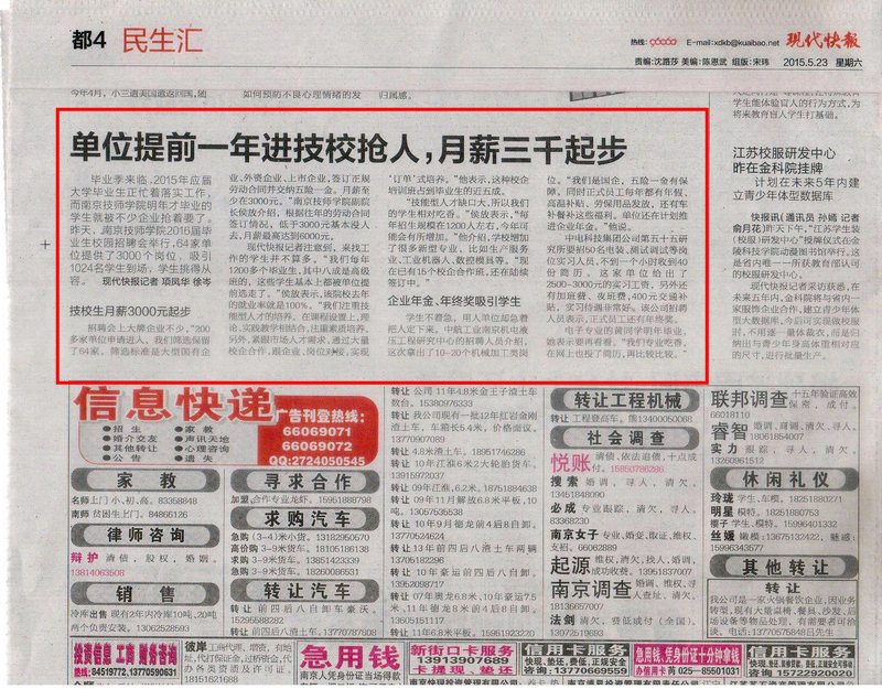 《现代快报》都4—“单位提前一年进技校抢人,月薪三千起步”