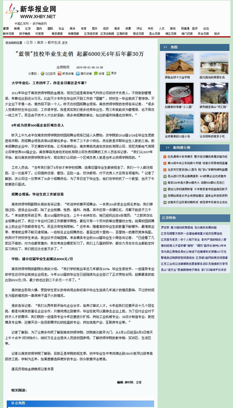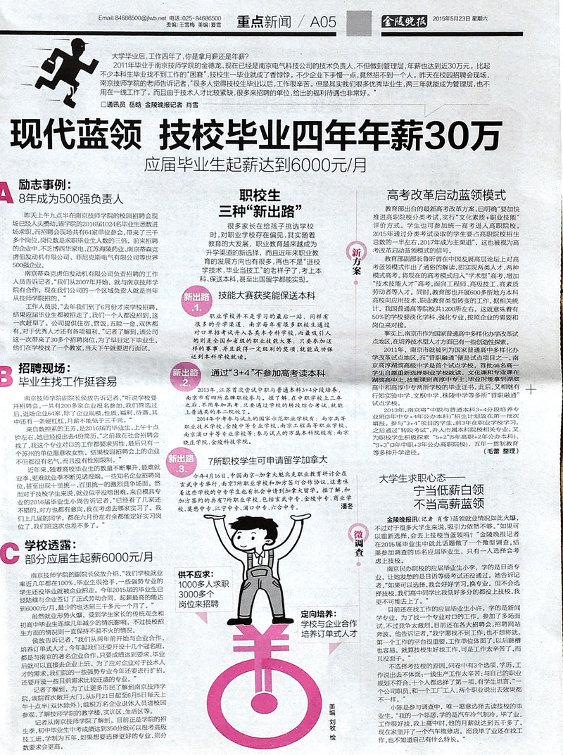 《金陵晚报》A05 新华报业网—“蓝领”技校毕业生走俏 起薪6000元4年后年薪30万
