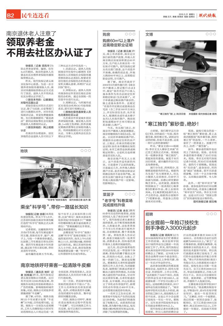 《现代快报》B2—企业提前一年抢订技校生到手净收入3000元起步