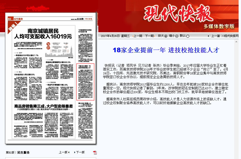《现代快报》B2—18家企业提前一年进技校抢技能人才