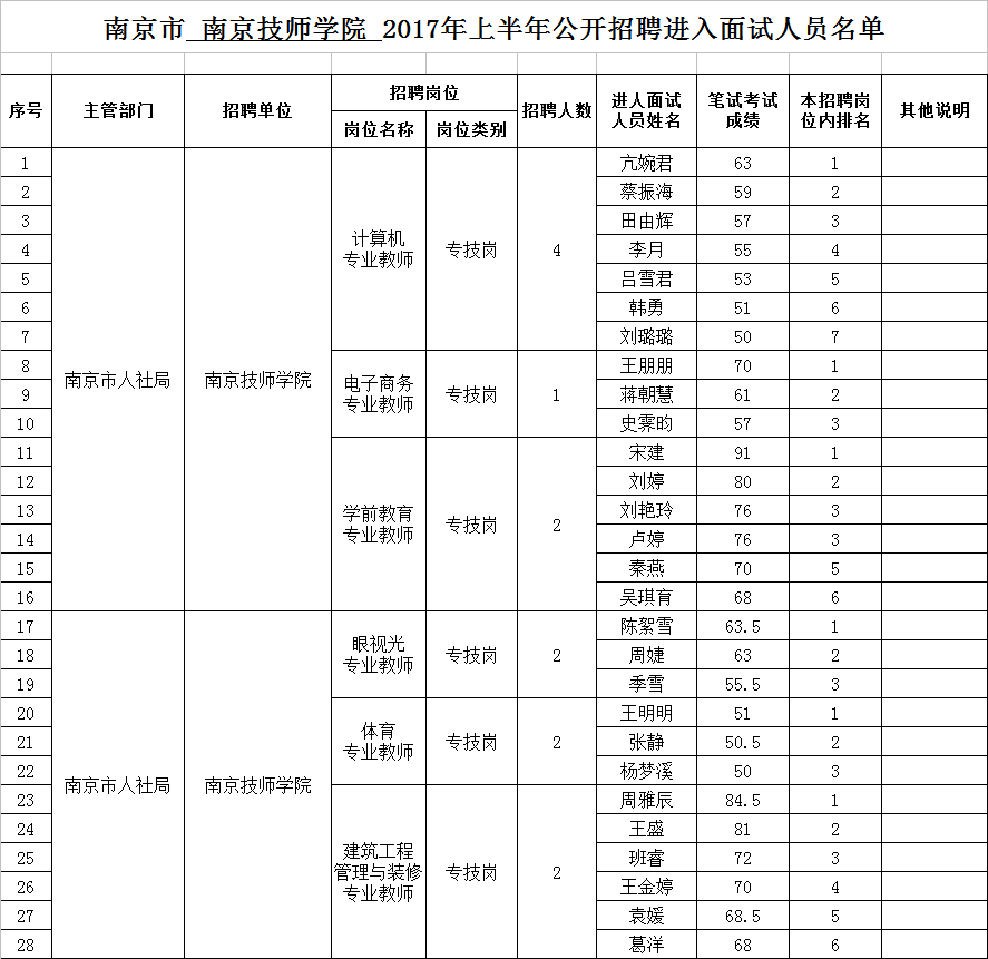 南京市 星空官方web版入口 2017年上半年公开招聘进入面试人员名单