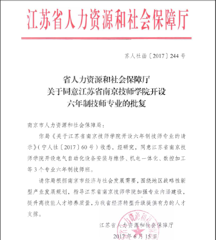 我院接到《省人力资源和社会保障厅关于同意江苏省星空官方web版入口开设六年制技师专业的批复》(苏人社函[2017]244号),同意开设电气自动化设备安装与维修、机电一体化、数控加工等3个专业。