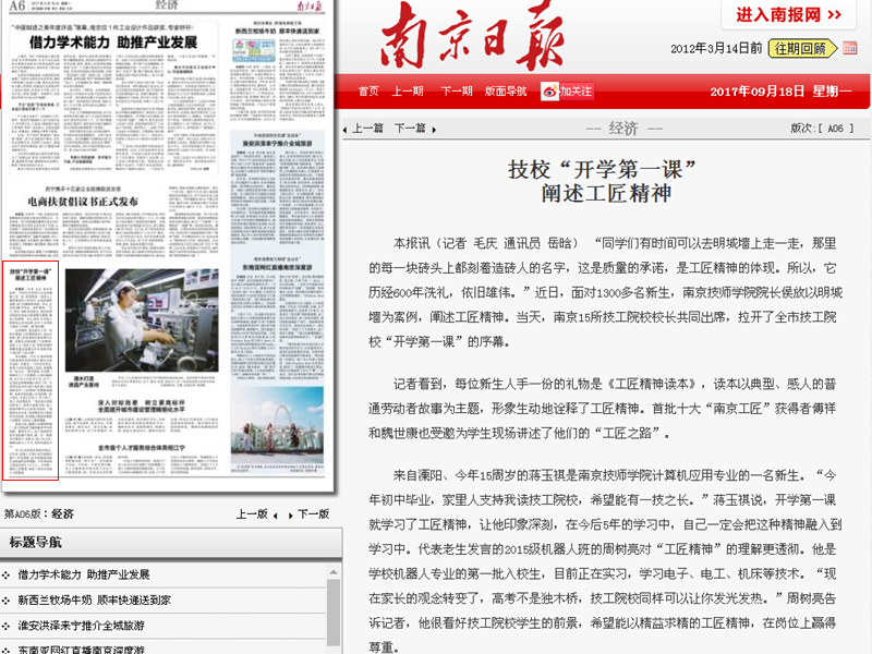 《南京日报》-A6 技校“开学第一课”阐述工匠精神