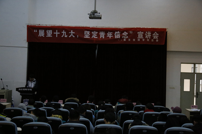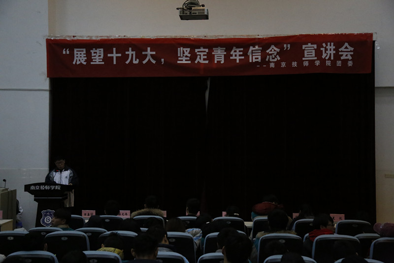 2017年12月26日下午,学院团委在实验楼阶梯教室举办以“展望党的十九大坚定青年信念”为主题的党的十九大宣讲会。该会由涂欣凡主持,一百多名团学干部参加了活动。