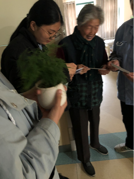 院方负责人告诉了我们这些老人的情况,他们大多是因为子女工作在外比较忙,没时间照顾他们才把他们送到这里,也有的是无儿无女,孤独一身的生活在这里。落寞的眼神、被岁月碾过的脸庞以及驼掉的脊背让我们的心不禁地揪紧。由于有的老人走路不方便,甚至一直都是坐在轮椅上,所以我们的成员到他们房间里小心翼翼的把他们搀扶出来到一楼大厅,还搬来板凳让老人们坐好。我们和老人围坐在一起,内心是无比的温馨感动。