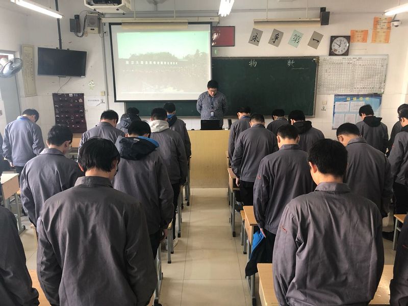 2018年12月13日是南京大屠杀死难者国家公祭日,上午10时国家公祭仪式开始,我院全体教工、学生在防空警报响起时默哀,全体学生在理论教室或实训场地中,保持立正站姿、脱帽、低头默哀致敬。