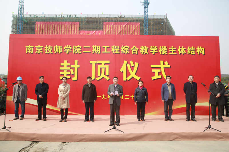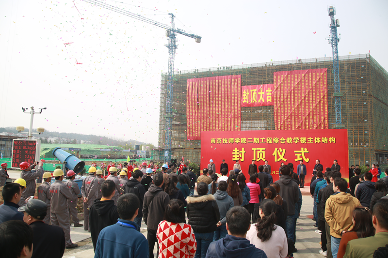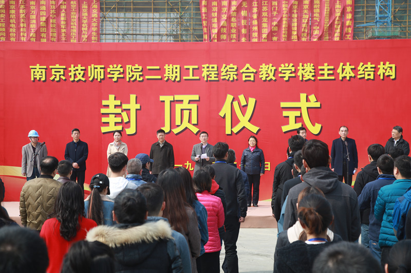 3月24日上午,星空官方web版入口举行二期工程综合教学楼主体结构封顶活动。市人社局党组书记、局长刘莅,仙林大学城管委会党工委委员、副主任孙金娣,市人社局巡视员周政学,副巡视员郁永春,江苏省建筑设计研究院有限公司、南京苏宁建设监理有限公司、南通四建集团有限公司等参建单位负责人以及学院部分教职工代表约100人参加活动。
