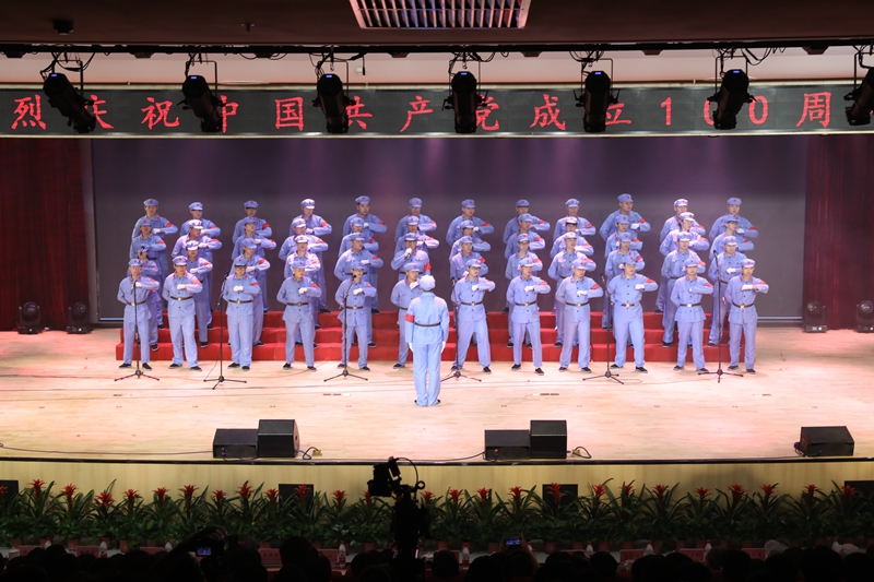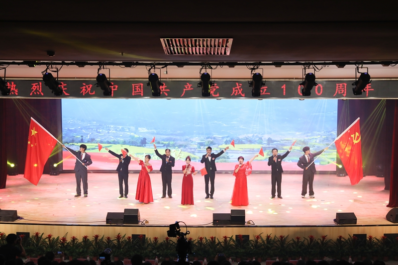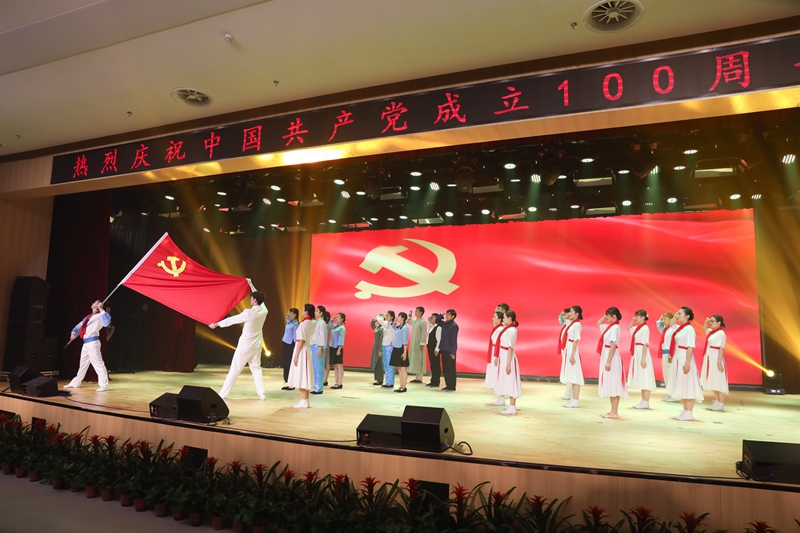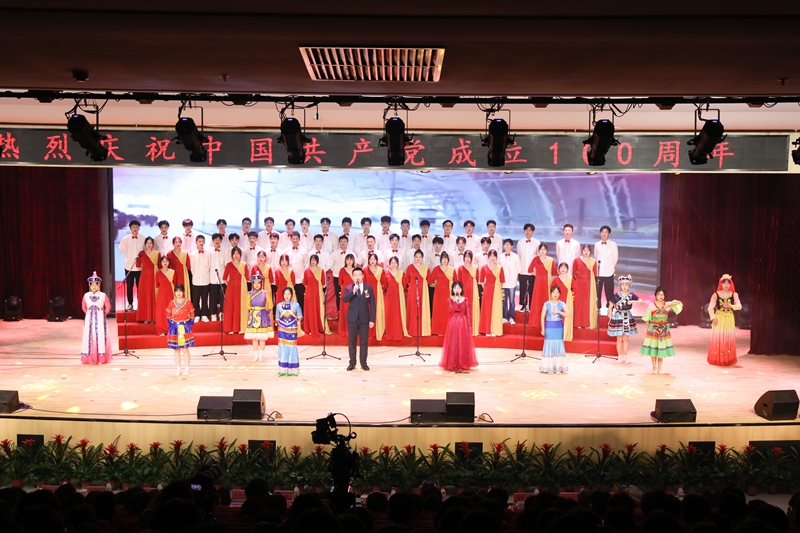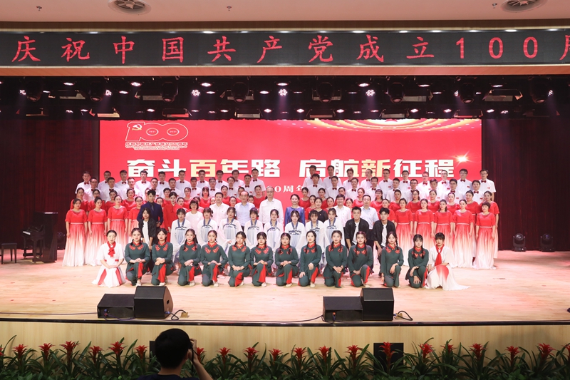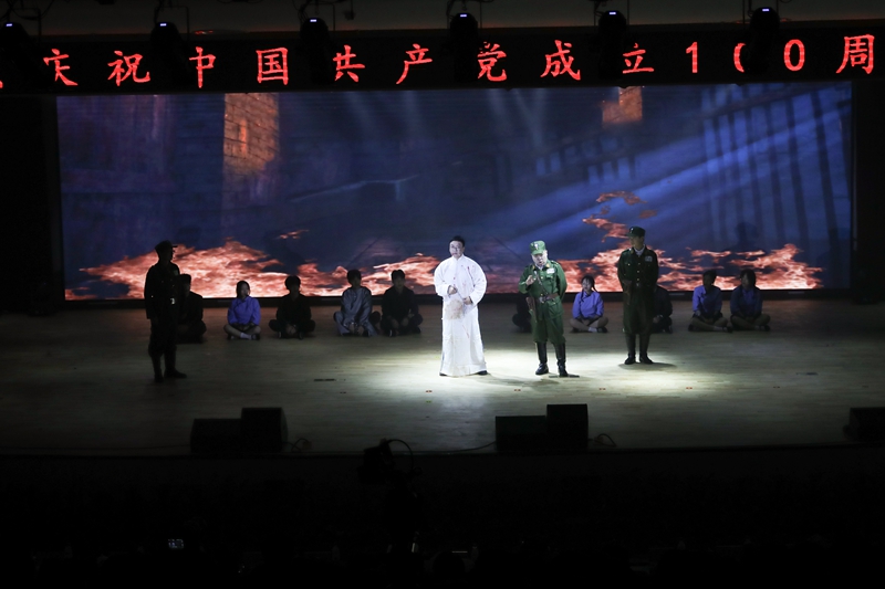 随后,全体人员共赏了师生倾力倾情打造的精彩节目。整场演出以庆祝建党100周年为主题,广大参演者通过大合唱、歌舞、情景剧、诗朗诵等不同艺术形式,将学党史的感悟融入创作,歌颂中国共产党成立百年来的光辉历程。演出在全场合唱《没有共产党就没有新中国》中圆满落幕。