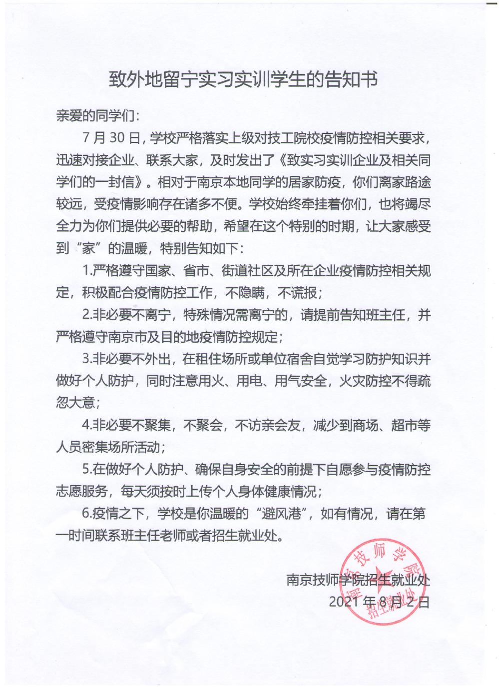 致外地留宁实习实训学生告知书