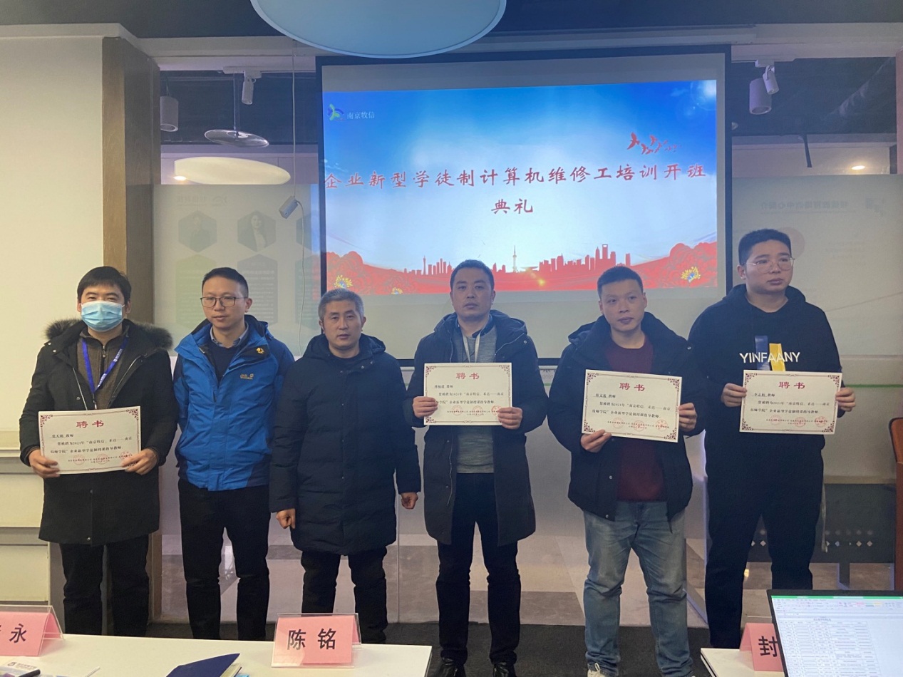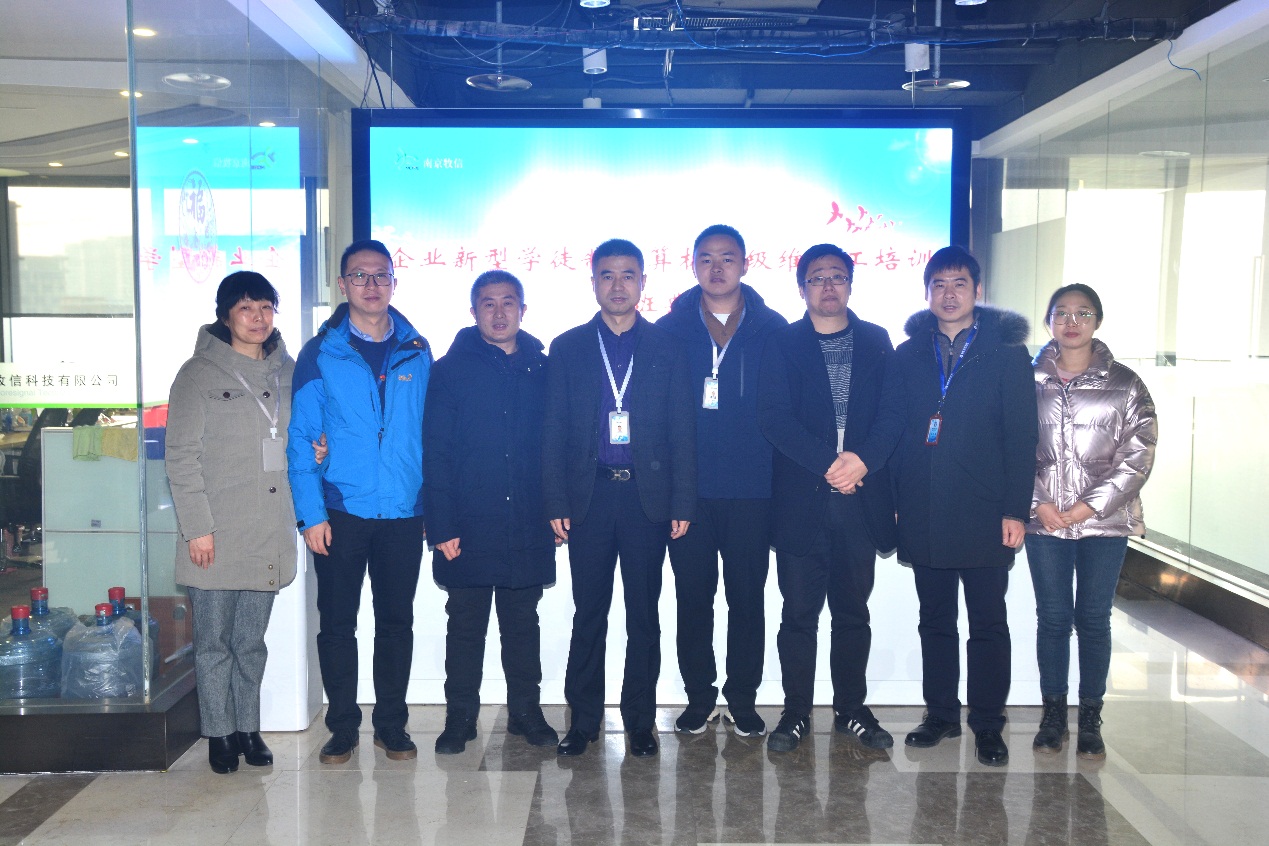 2022年1月11日,星空官方web版入口在南京牧信科技有限公司(南京禾达信息有限公司)举行了企业新型学徒制培训班的开班仪式。出席本次开班仪式的有牧信科技副总陆冬昀、经理沈碧英、技师学院招生就业处副主任陈铭、信息技术系副主任李永、教师代表王修喜和班主任蔡敏等。两家企业属关联公司在同层办公,因此开班后将采取合班授课形式,一共40名学员参与培训。