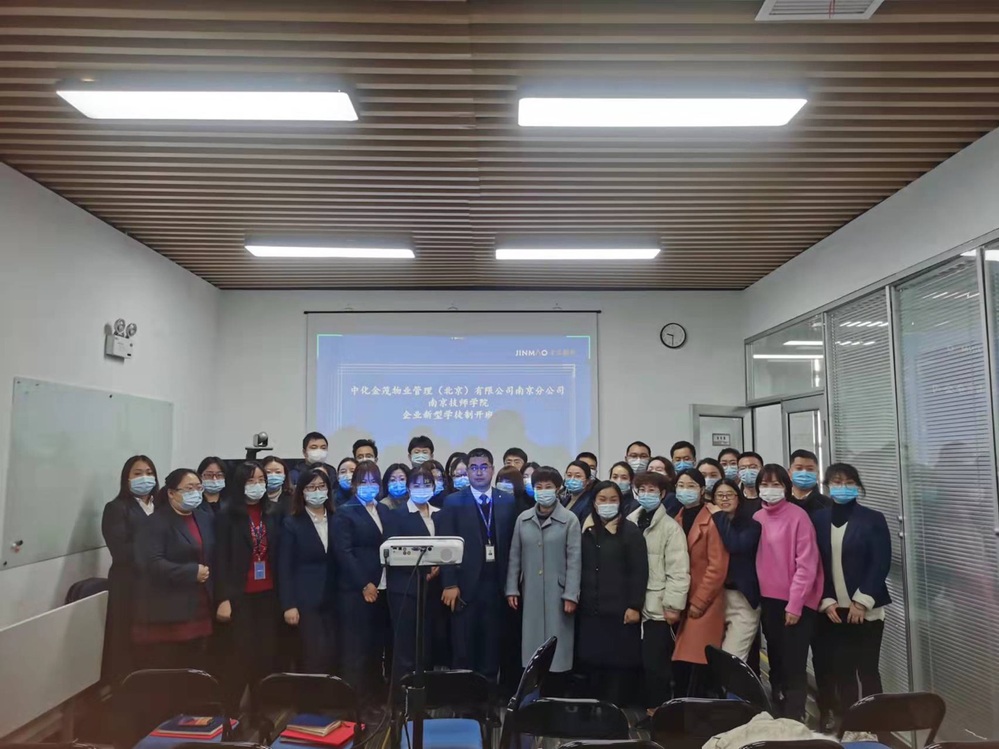 2022年1月19日下午,星空官方web版入口现代服务系、中化金茂物业管理(北京)有限公司南京分公司企业携手举办新型学徒制培训开班典礼。金茂服务南京中心城市公司总经理助理王善知、星空官方web版入口招生就业处副主任郑燕、现代服务系副主任胡珍霞以及相关专业教师和各岗位代表员工参加了开班典礼。