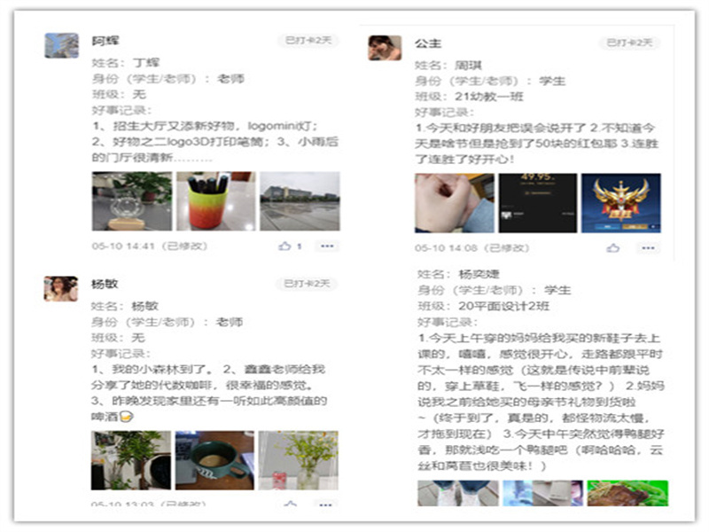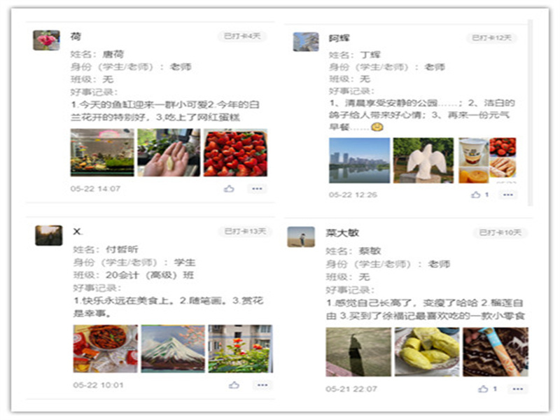 “每日三件好事活动”以在微信小程序打卡的方式,为全院师生记录着生活的点滴,分享生活的乐趣的平台。全院师生积极参与,积极分享。
