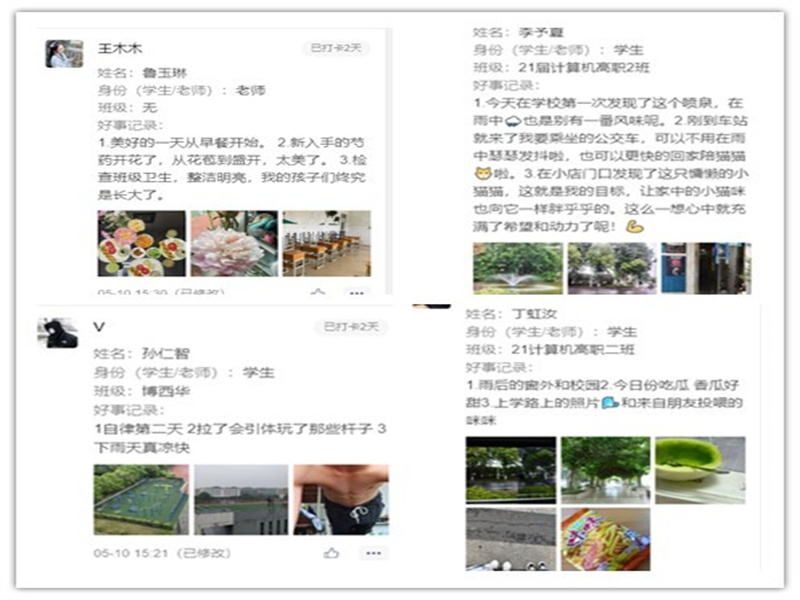 为缓解我院师生疫情常态化管理期间产生的压力,响应省教育厅“向阳携行,共创未来——大学生心理健康江苏行”主题教育活动,营造欢乐轻松的校园氛围,我院心理协会于5月9日至5月22日发起“寻找生活里的小确幸——每日三件好事”打卡活动。