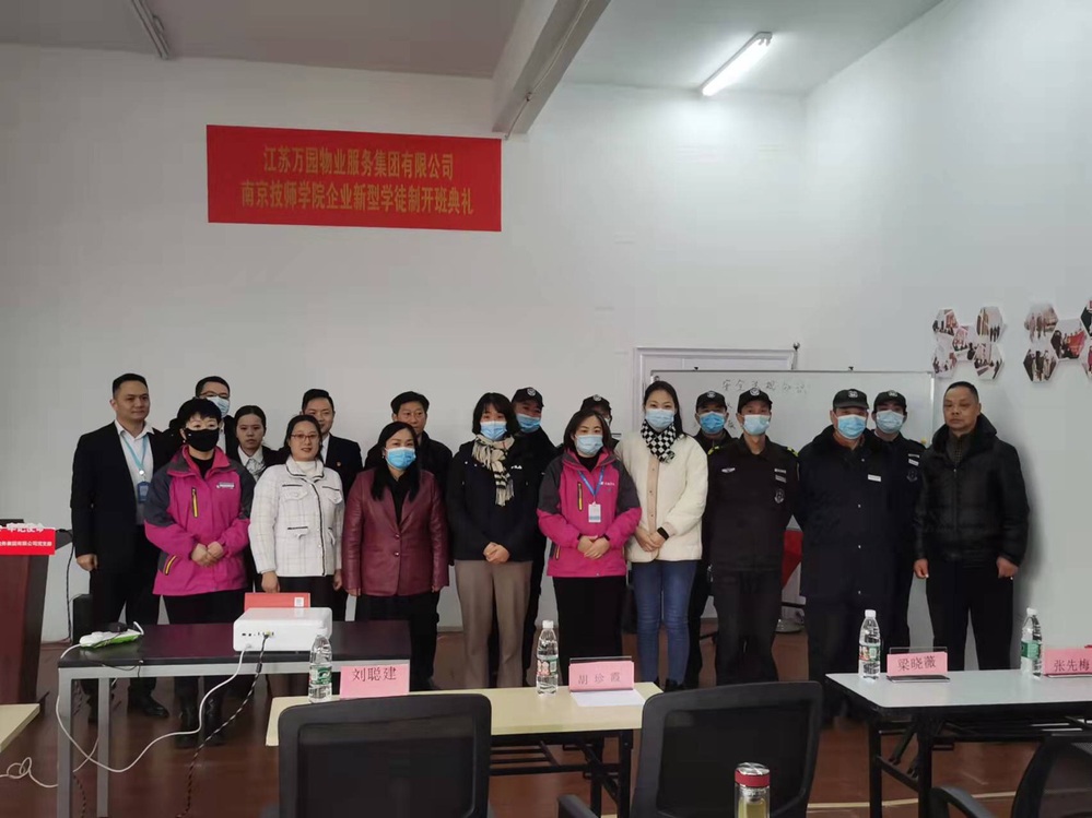 2022年1月21日上午,星空官方web版入口现代服务系携手江苏万园物业服务集团有限公司举办现代学徒制培训开班典礼在万园物业管理中心顺利举办。万园物业企业发展中心总监刘聪建、星空官方web版入口现代服务系副主任胡珍霞以及相关专业教师和各岗位员工代表参加了开班典礼。