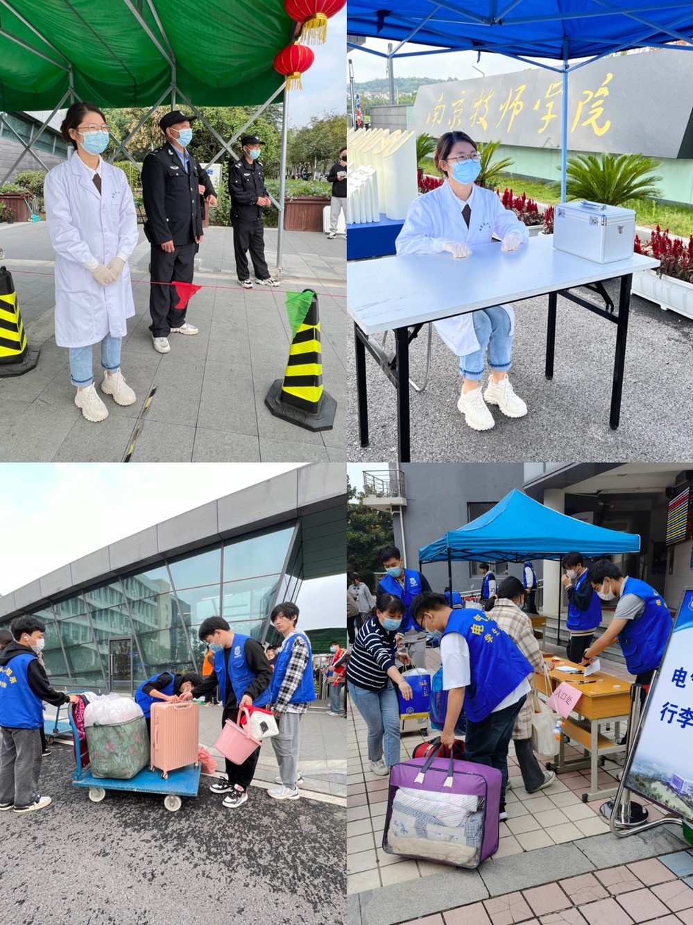 因疫情防控需要,我于东北门东南门设立测温通道与临时观察点,医生护士驻守测温点,新生进校须查验两码与48小时核酸检测报告,严格测温、佩戴口罩后方进入校园。