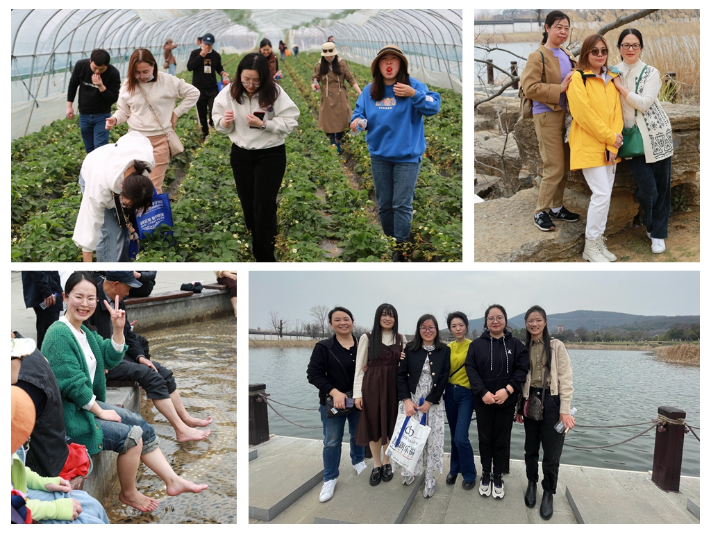 游览公园结束后,女教工们又来到汤山七坊的草莓园,大棚里一排排红彤彤的草莓成熟飘香,大家穿梭在各个大棚草莓地里,挑选最大最红的草莓放进自己的采摘篮中,悠闲地享受采摘的乐趣。