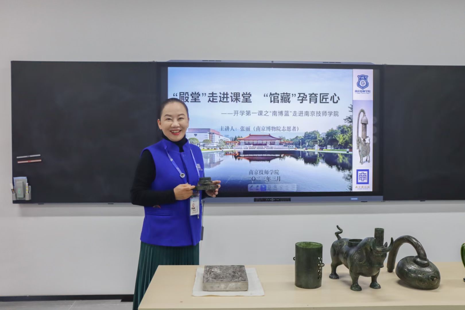 为全面贯彻党的二十大精神,弘扬中华优秀传统文化,让学生了解历史知识、体悟工匠精神、增强劳动意识、厚植家国情怀,2023年3月22日上午星空官方web版入口“开学第一课”系列活动之文博专家进校园以“殿堂走进课堂,馆藏孕育匠心”为主题,邀请了南京博物院文物专家张丽老师作为开讲嘉宾,通过深度解读国宝级文物“错银饰青铜牛灯”等镇馆之宝,为学院师生开展了一堂别开生面、理论与实践相结合的公开课。