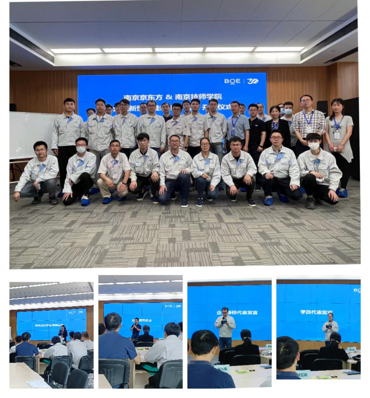 南京京东方 HRBP部部长高强,电气工程系系主任吴佑林,学院招生就业处副主任郑燕、陈铭,企业班主任郭翔宇,学院班主任贾金红,部分企业导师及新型学徒学员参加了本次开班仪式。