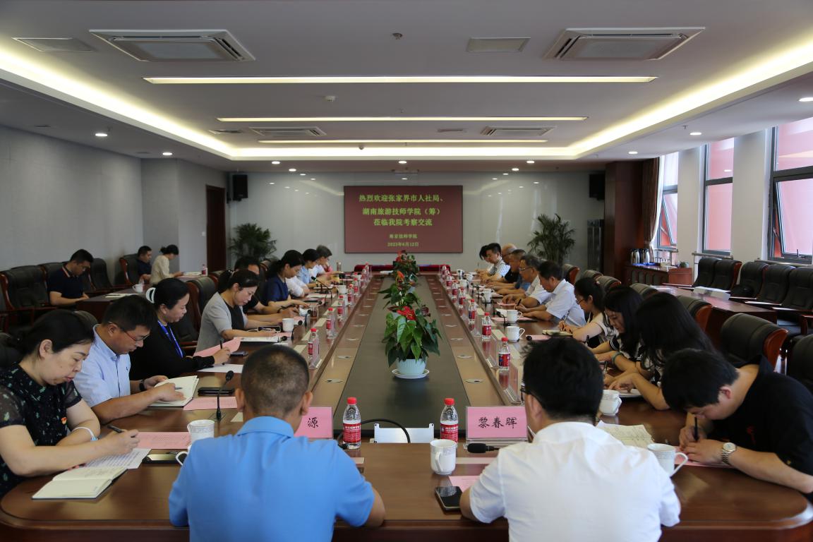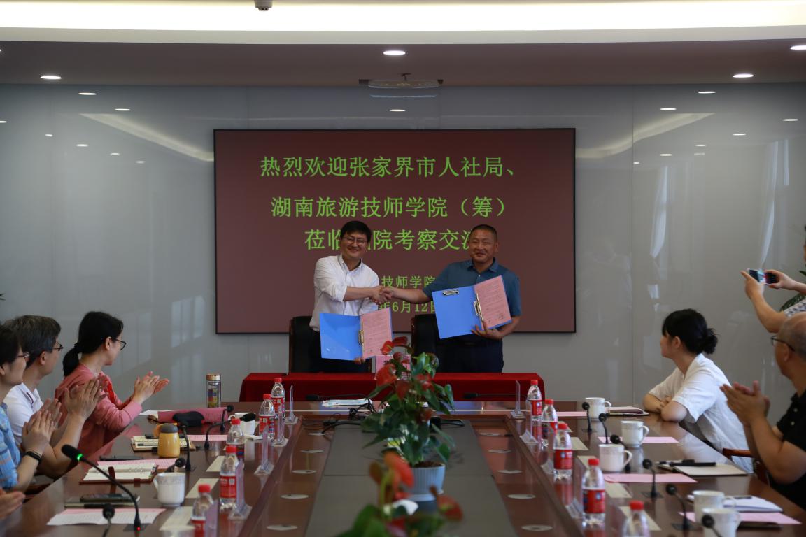 6月12日上午,张家界市人力资源和社会保障局二级调研员刘奇志、湖南旅游技师学院(筹)党委书记欧阳仁德带队来校考察交流,对接对口合作落实措施,并签订校校对口合作协议。星空官方web版入口党委书记张金梅、副院长赵杰,湖南旅游技师学院(筹)副校长姚志勇及双方相关人员参加了座谈交流。