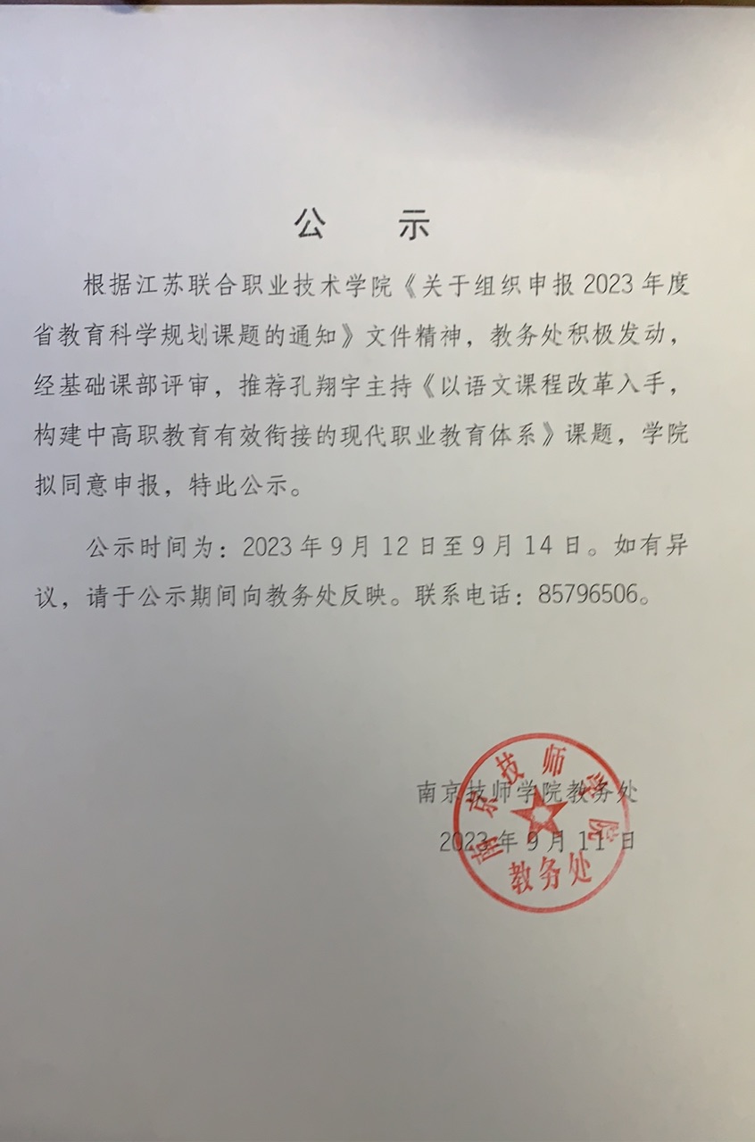 申报江苏联合职业技术学院课题的公示