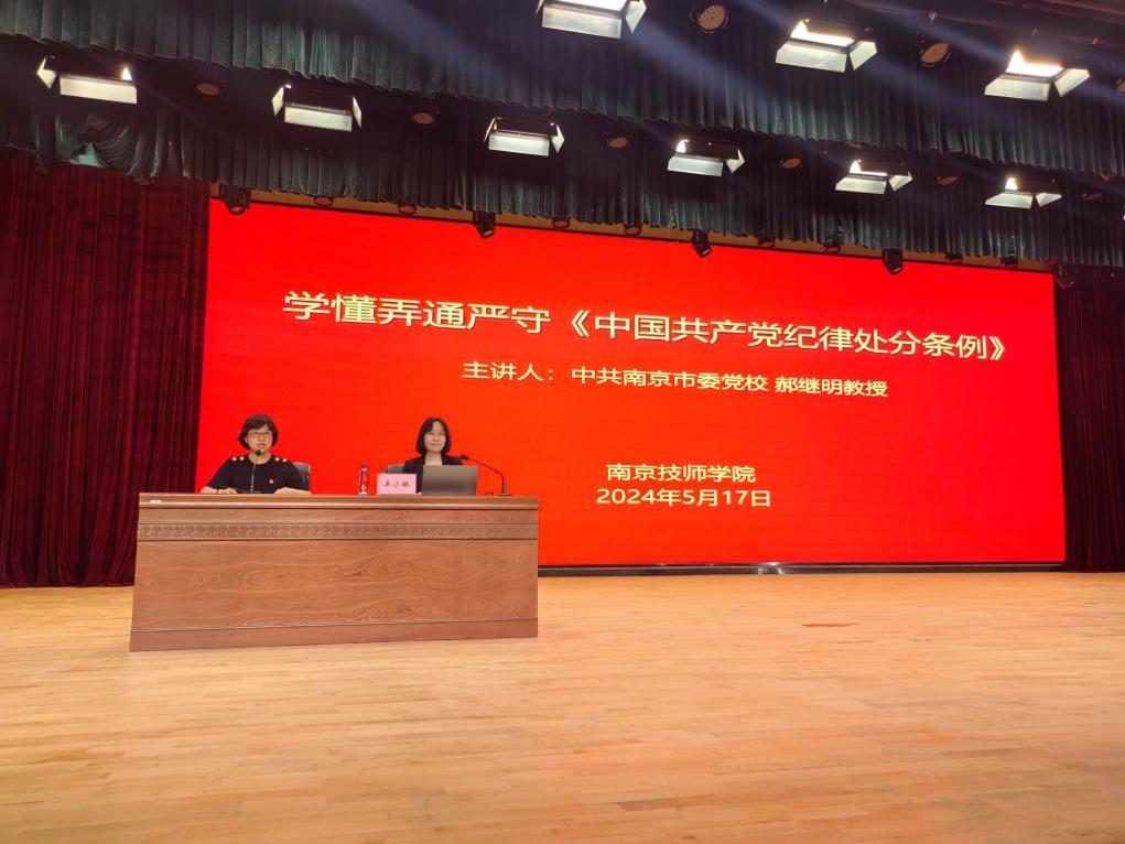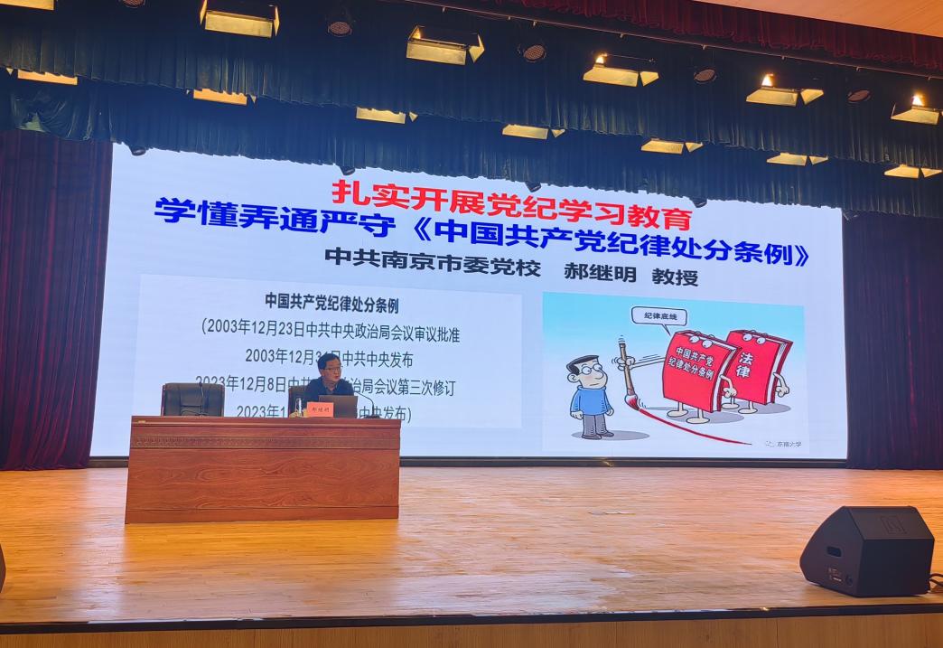 为深入开展党纪学习教育,营造学纪知纪明纪守纪的浓厚氛围,5月17日下午,学院特别邀请南京市委党校郝继明教授开展了主题为“学懂弄通严守《中国共产党纪律处分条例》(以下简称《条例》)的讲座。市人力资源和社会保障局党委委员、市人才中心主任卓小琳同志和学院领导、全体中层干部、党员干部共同参加,本次讲座由学院纪委书记俞岚同志主持。