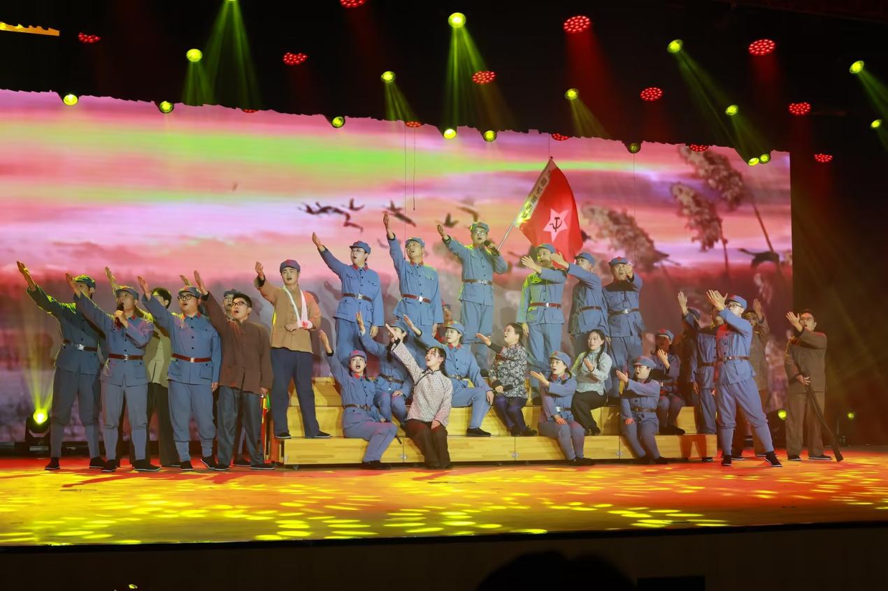 比赛中,学院各党支部和团总支共选送了12支队伍同台展示。党员教师们先后呈现了《中国人》《映山红》《南泥湾》《领航》等经典曲目,用真挚的情感、嘹亮的歌声诠释了党员的责任与担当;团员同学们以《红旗飘飘》《四渡赤水出奇兵》《我爱你中国》《天耀中华》等歌曲献礼,展现了新时代青年的昂扬风貌。参加表演的师生们精神饱满、编排精巧,舞台上灯光与旋律交融,歌声与掌声共鸣,一首首红歌穿越时空,既重现了救亡图存的峥嵘岁月,又唱响了新时代的奋进之歌。演出接近尾声,学院广播台的同学们还特别奉献了情景舞台剧《我有一束光》,以深情演绎传递信仰力量,赢得了全场阵阵掌声。