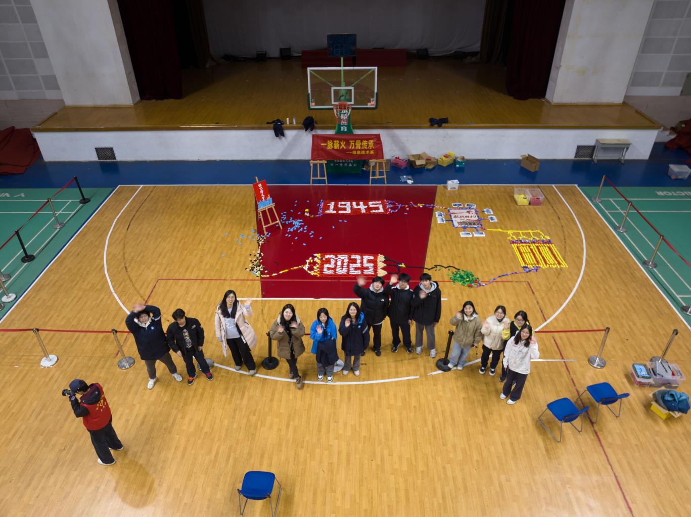 推倒仪式环节,随着导引牌应声倾倒,骨牌依次联动,场面震撼人心。各参赛队队长详细讲解作品的设计理念与深层象征意义,让在场师生在视觉盛宴中重温峥嵘岁月,感悟家国情怀及工匠精神。
